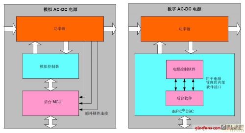 模擬電源與數字電源的功率鏈部分、驅動電路和反饋電路保持一致。圖2 分別展示了上述例子中所描述的數字電源。對於數字控製電源,專用模擬控製器和後台管理電路可合並采用一片dsPIC??DSC 來實現。