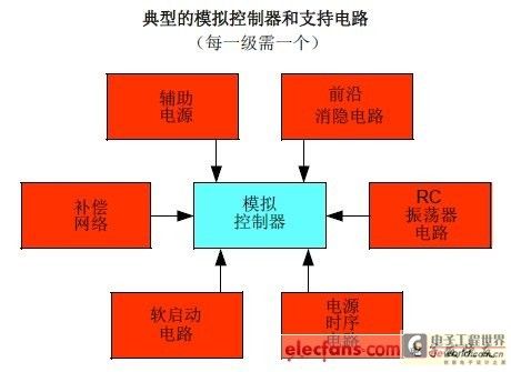 圖1和圖2僅從較高層次展示了兩者的主要差別;然而,在進行對比時所有支持電路也需包括在內。圖3 所示為每個模擬級中的支持電路,而圖4 則為數字係統中的支持電路。注意模擬控製器所需要的額外連接(在圖3 和圖4 中用箭頭標出)。