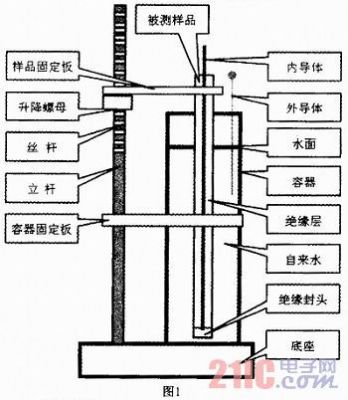 將(jiang)被(bei)測(ce)樣(yang)品(pin)下(xia)端(duan)用(yong)絕(jue)緣(yuan)物(wu)質(zhi)封(feng)住(zhu)端(duan)口(kou),放(fang)入(ru)盛(sheng)有(you)自(zi)來(lai)水(shui)的(de)容(rong)器(qi),利(li)用(yong)樣(yang)品(pin)固(gu)定(ding)板(ban)將(jiang)樣(yang)品(pin)固(gu)定(ding)。由(you)於(yu)水(shui)是(shi)導(dao)電(dian)液(ye)體(ti),流(liu)動(dong)性(xing)好(hao),能(neng)夠(gou)均(jun)勻(yun)地(di)包(bao)裹(guo)在(zai)絕(jue)緣(yuan)層(ceng)外(wai)麵(mian),在(zai)水(shui)中(zhong)插(cha)入(ru)一(yi)根(gen)導(dao)線(xian)(裸銅線),相當於在絕緣層外增加一個電極。將電容測試儀的測量夾,分別連接到內外兩個導體,即可測量外導體和內導體之間的電容值。