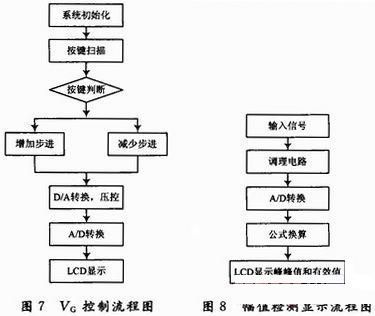 MSP430係列單片機是美國德州儀器(TI)1996年開始推向市場的一種16位超低功耗的混合處理器(Mixed Signal Processor)。由於它具有極低的功耗、豐富的片內外設和方便靈活的開發手段,已成為眾多單片機係列中一顆耀眼的新星。對於MSP430係列而言,由於引進了FLASH型程序存儲器和JTAG技術,不僅使開發工具變得簡便,而且價格也相對低廉,並且還可以實現在線編程。程序采用C語言開發。VCA810的VG控製以及輸出電壓幅值檢測、顯示的流程圖如圖7、圖8所示。
