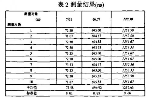 由關係式(2)可知,對已知材料的電纜,電纜長度L與發射脈衝與反射脈衝間時間間隔Δt成正比。通過對已知長度的電纜發射脈衝與反射脈衝的時間間隔進行測量,可以對時間間隔測量模塊的特性進行驗證。本文對長7.01m,66.77m和120.30m的電纜分別進行多次測量,測量結果如表2所示。