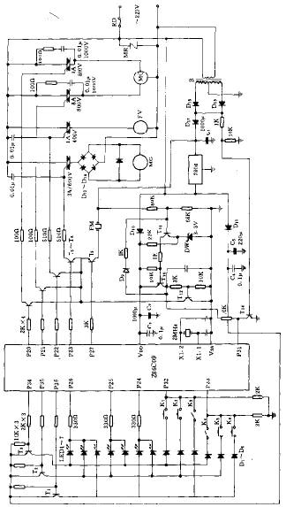 過零檢測電路由晶體管T14,變壓器B和二極管D17~D19組成。D17起隔離作用,在電壓為零時,脈動電壓為零,T14截止。由於T14的集電極電阻接到T10的集電極,隻有在T10導通,即電源電壓正常,T14才能在電源電壓過零時輸出高電平。Z86C09的P3.1端檢測過零信號。