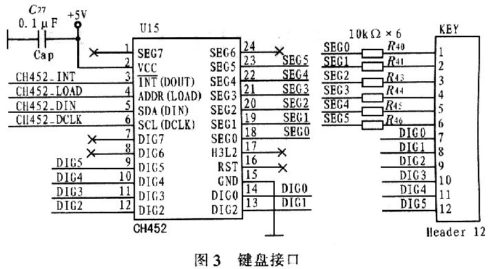圖3為基於CH452的鍵盤接口電路。為了防止按鍵被按下後,CH452的SEG信號線與DIG信號線形成短路,在CH452的DIG0~DIG5引腳與鍵盤矩陣之間串聯有限流電阻,圖3中R40~R46,其阻值為10 kΩ。CH452采用4線製與主處理器ATxmegal28A1鏈接,占用主處理器1個中斷接口和l組SPI接口。