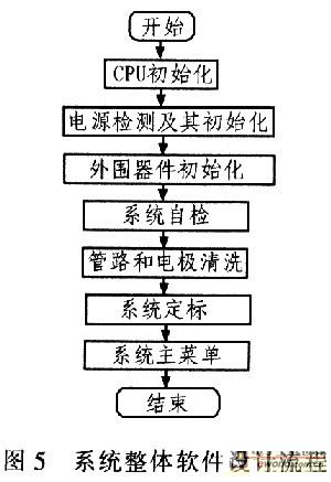 該係統軟件開發采用ATMEL公司提供的AVRStudio開發環境,並在該開發環境中內嵌了支持C語言的GCC。分析儀軟件全部采用C語言編寫,這樣開發周期縮短,維護便捷。該係統軟件設計采用層次化模塊化結構設計,共分為兩個層次,第l層是按照硬件各個功能模塊編寫相應的驅動和接口程序,包括液晶顯示、打印機、按鍵處理、步進電機、A/D采集轉換、係統時鍾、檢測和電源管理等模塊;第2層是在第1層的基礎上按照使用功能編寫的應用程序模塊,有主菜單、樣本分析、質控分析、質控統計、係統設定、係統校準、電極清洗、數據儲存及查詢和係統自檢等模塊。圖5中給出係統整體軟件設計流程。