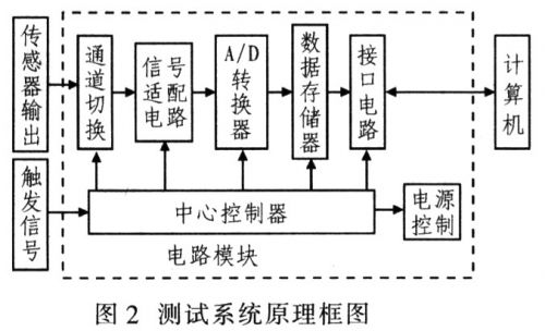 存儲測試係統包括:陀螺輸出,信號處理(通道切換、信號適配電路、A/D轉換器、數據存儲器),係統控製(中心控製器、電源控製)和接口電路4個ge部bu分fen。對dui三san維wei角jiao速su度du信xin號hao采cai用yong的de是shi連lian續xu采cai樣yang的de方fang法fa,需xu要yao進jin行xing通tong道dao切qie換huan。陀tuo螺luo輸shu出chu的de是shi電dian壓ya信xin號hao,可ke先xian進jin行xing通tong道dao切qie換huan再zai進jin行xing信xin號hao適shi配pei,這zhe樣yang電dian路lu板ban的de麵mian積ji可ke以yi減jian小xiao,進jin一yi步bu減jian小xiao測ce試shi儀yi的de體ti積ji。通tong過guo通tong道dao切qie換huan依yi次ci把ba傳chuan感gan器qi信xin號hao送song至zhi信xin號hao適shi配pei電dian路lu,經jing調tiao理li後hou送song至zhiA/D轉zhuan換huan器qi,將jiang模mo擬ni量liang轉zhuan換huan為wei數shu字zi量liang,存cun入ru存cun儲chu器qi。當dang觸chu發fa信xin號hao到dao來lai後hou,測ce試shi係xi統tong記ji錄lu完wan預yu設she的de容rong量liang,中zhong心xin控kong製zhi器qi給gei出chu模mo擬ni電dian源yuan關guan斷duan信xin號hao,電dian源yuan控kong製zhi器qi停ting止zhi記ji錄lu,測ce試shi係xi統tong進jin入ru省sheng電dian模mo式shi。係xi統tong等deng待dai計ji算suan機ji發fa讀du數shu指zhi令ling由you接jie口kou電dian路lu將jiang數shu據ju讀du出chu。設she計ji了le相xiang應ying的de接jie口kou電dian路lu,USB口和並口都可讀取測試裝置的數據。