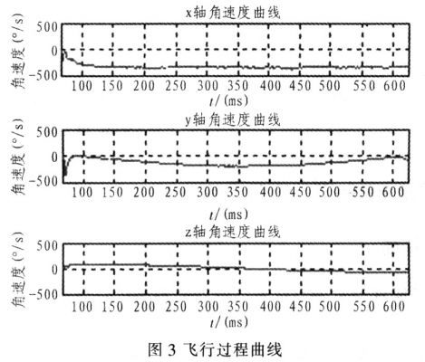 存儲測試係統已經成功應用於某小型飛行體的試驗,成功獲得了測試數據。下麵是實測曲線及其分析,x軸為自轉軸,z軸為飛行方向。實測飛行過程角速度信號如圖3所示,圖3中,3個軸的角速度曲線在70 ms處均有一個小鼓包,為陀螺的加速度效應在曲線上的表現。