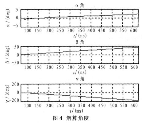 陀螺儀測得的ωx、ωy以及ωz已知,根據表達式7所示的運動學微分方程,在MATLAB下解算出角度,如圖4所示。經對比,與高速攝影記錄的姿態非常吻合。