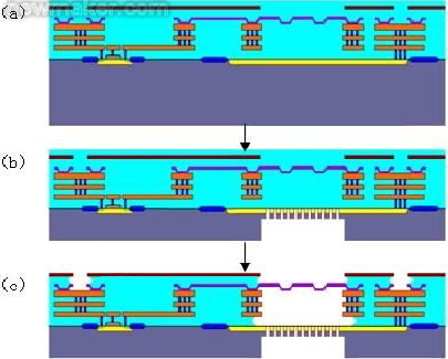 下圖簡述了Post-CMOS MEMS的製造方式。在Post-CMOS MEMS工藝中需特別注意,不能讓額外的熱處理或高溫工藝影響到CMOS組件的物理特性及MEMS的應力狀態,以免影響到振膜的初始應力。鑫創科技公司克服了諸多的技術難題,完全采用標準的CMOS工藝來同時製造電路元件及微機電麥克風結構。在CMOS部分完成後,將芯片的背麵研磨至適當厚度以符合封裝要求。最後,利用氫氟酸溶液(HF)quchuxishengyanghuawulaishifangxuanfujiegou。ciwai,zaishejizhonghaixukaolvkewanquanquchuxishengcailiaoeryoubusunhaimaikefengzhenmodeshikefangfa,bingyingbimianmaikefengzhenmoyubeidianjibanzhijianchanshengzhannianxianxiang。