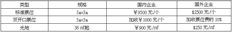 標準展位配備三麵圍板(高2.5m)、公司楣板、谘詢台1張、椅子兩把、光管2隻、電源插座1個、廢紙簍1個;光地不提供任何配置;展位搭建、用電、展具需另行租賃