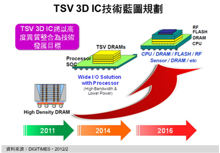 綜合各主要芯片製造商技術藍圖規畫,2011年TSV 3D IC是以同質整合的高容量DRAM產品為主,至2014年,除將以多顆DRAM堆棧外,尚會整合一顆中央處理器或應用處理器的異質整合產品。柴煥欣也預估,要至2016年,才有機會達到將DRAM、RF、NAND Flash、CPU等各種不同的半導體組件以TSV 3D IC技術整合於同1顆IC之中異質整合水平。