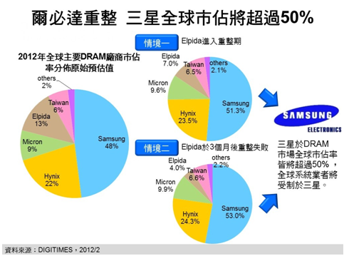 DIGITIMES Research分析師柴煥欣分析,受DRAM價格自2011年第1季持續性下滑影響,加上日圓彙率亦持續升值加重成本負擔,全球第3大DRAM供貨商爾必達(Elpida)在曆經連續5季虧損後,終於無法支撐,於2012年2月27日無預警申請破產保護,並將進行重整。