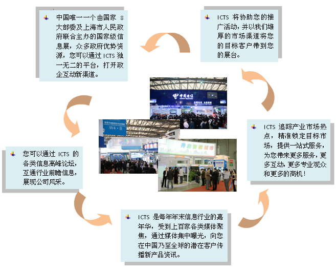 ICTS作為中國最具影響力的國際工業品牌展“中國國際工業博覽會”下xia最zui重zhong要yao的de專zhuan業ye展zhan之zhi一yi,多duo年nian來lai依yi托tuo中zhong國guo戰zhan略lve性xing新xin興xing產chan業ye的de政zheng策ce導dao向xiang,立li足zu市shi場chang需xu求qiu,站zhan在zai行xing業ye的de前qian沿yan,聚ju焦jiao業ye內nei熱re點dian,為wei信xin息xi企qi業ye提ti供gong集ji產chan品pin展zhan示shi、信息交流、供需交易於一體的高端營銷平台,同時,也是中國每年年底前的信息業內人士聚會的嘉年華。