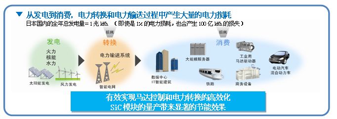 此產品安裝在工業設備和太陽能電池等中負責電力轉換的變頻器、轉換器上,與普通的Si(矽)材質的IGBT模塊相比,具備以下優勢,有效解決了世界能源和資源等地球環境問題。