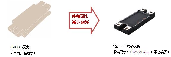 - 與傳統的400A級別的Si-IGBT模塊相替換時,體積減小約50%
