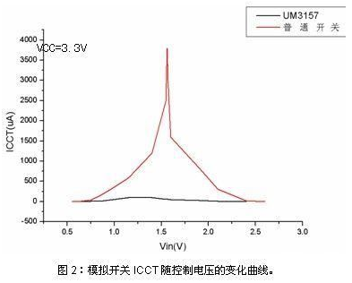 圖2中可以看出采用該改善技術的英聯UM3157模擬開關產品與普通同係列模擬開關產品在ICCT上的顯著區別。