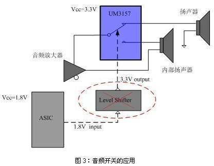 此外,英聯的低ICCT係列模擬開關具有更低的VIH電平值,可以使用較低的控製電平實現開關的高電平切換控製。產品的這種特性大大減少了係統工程師設計電路的複雜性,tebieshizaigongdiandianyuanhekongzhixinhaodianpingbupipeidebianxiechanpinyingyongzhongkeyimianchushiyongdianpingzhuanhuanmokuai,congeryouxiaojiangdilechengben。yimonikaiguanyonglaiqiehuanyinpinxinhaoweili,rutu3所示,可以使用ASIC傳輸過來的1.8V電壓直接來控製UM3157的控製管腳,而不必采用電平轉移器也能在實現開關切換的同時達到很小的漏電流。此外,由於低ICCT模擬開關不消耗很多功耗(大約1uA),且開關的導通電阻隨工作電壓的增加而降低,設計人員可以使用較高的供電電壓來達到更低的導通電阻。對於典型的音頻開關或USB應用,低的導通電阻是非常重要的。