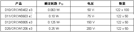 本次發布的4款設計套件采用E96係列阻值標準,範圍從10Ω到1MΩ(每檔間隔4個阻值),同時額外包含一個0Ω跳線,每款套件總共包含122種不同的阻值。電阻的容差為±1%,TCR為±100ppm/K,功率耗散為0.063W~0.25W,電阻芯電壓為50V~200V。