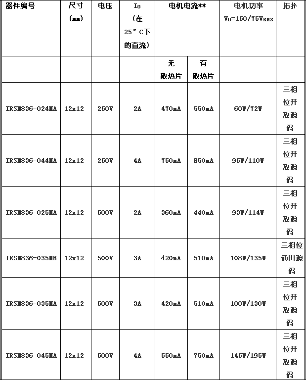全新µIPM係列采用超小型12x12x0.9mmPQFN封裝,配備多種充分整合的三相位表麵貼裝電機控製電路解決方案。IR為相關市場率先引入全新的方法,采用PCB銅tong線xian幫bang助zhu模mo塊kuai散san熱re,從cong而er通tong過guo較jiao小xiao的de封feng裝zhuang設she計ji來lai減jian少shao成cheng本ben,甚shen至zhi省sheng卻que對dui外wai置zhi散san熱re片pian的de需xu要yao。此ci外wai,與yu傳chuan統tong雙shuang重zhong內nei嵌qian式shi模mo塊kuai方fang案an相xiang比bi,標biao準zhunQFN封裝技術通過省卻通孔第二通道組裝和提升散熱性能可以進一步簡化裝配過程。