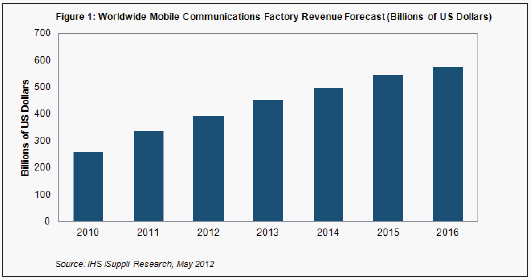 上述預測數據由無線通信產業各領域中的OEM廠商的總體工廠營業收入構成,包括手機、媒體平板和移動基礎設備等主要領域,以及無線路由器、無繩電話、電池充電器和灰市手機等輔助領域。