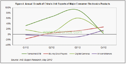 據IHS iSuppli公司的中國研究服務,2012年第一季度中國主要消費電子產品的出口高於預期,主要是因為銷售渠道中的庫存較低,需要購買更多產品以補充庫存。