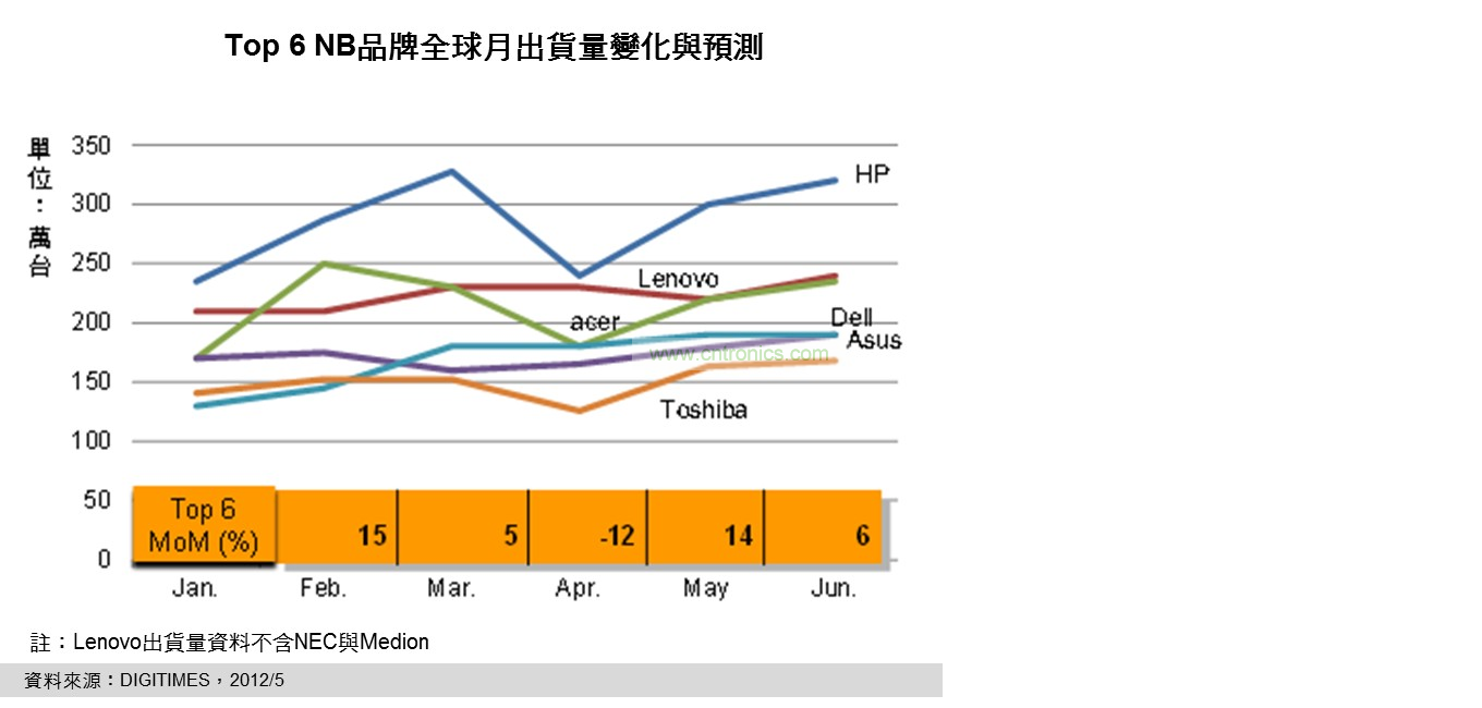 DIGITIMES Research資深分析師兼主任簡佩萍分析,品牌與代工廠NB月出貨量方麵,在曆經低迷的4月後,5月搭配英特爾(Intel)新品NB鋪貨效應,出現兩位數的月成長幅度;但整體而言仍較先前預測的出貨成長緩和許多,尤其對6月份的出貨展望,全球前6大品牌普遍保守,預期前6大品牌月NB出貨量成長幅度也將因此驟降至個位數。