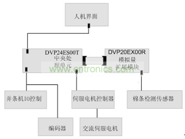 該控製係統的中央處理單元使用台達DVP E係列的PLC,伺服控製係統使用台達ASDA係列產品,人機界麵使用選配DOP-B係列觸摸屏。工作時,PLC通過DVP20EX00R模擬量控製模塊讀取棉條檢測傳感器的棉條厚度,對編碼器信號的處理計算出勻整1羅拉的速度,依據勻整控製關係式,就可計算出勻整2羅拉的轉速,再通過伺服控製器控製伺服電機,以達到對勻整2羅拉的控製。
