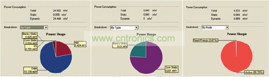圖 1: IC 組件處於完全打開(左)、睡眠模式(中)和 80% 睡眠模式和20% 打開模式的組合(右)時的功耗。
