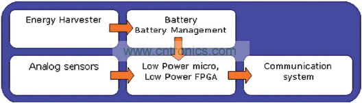 能量采集係統的工作原理是收集能量以將其存儲在電池中: 係統通常由電池供電,而非由能量采集器直接供電。因此,能量采集器供電的係統實際上在結構方麵非常類似於傳統的電池供電產品(參閱圖 2)。