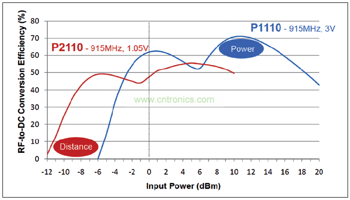 許多采集技術仍是開發工作的重點。 但是,OEM 可以利用現成商用組件實施當前切實可行的能量采集電源係統。小型電子設備的無線電頻率 (RF) 和太陽能采集目前都受到組件製造商的支持。 就 RF 能量采集而言,美國製造商Powercast 提供了 P1110 和 P2110,它們能將 850MHz 至950MHz 頻率範圍內的無線電發射轉換為輸出電壓介於 1.8V與 4.2V 之間的 DC 電能,如圖 4 所示。設備可以使用 1GHz以下頻率波段中的雜散 RF 發射提供功率輸出,以便為嵌入主機設備的電池充電。 無線傳感器是通過 P1110 或 P2110使用環境 RF 能量的典型終端產品。