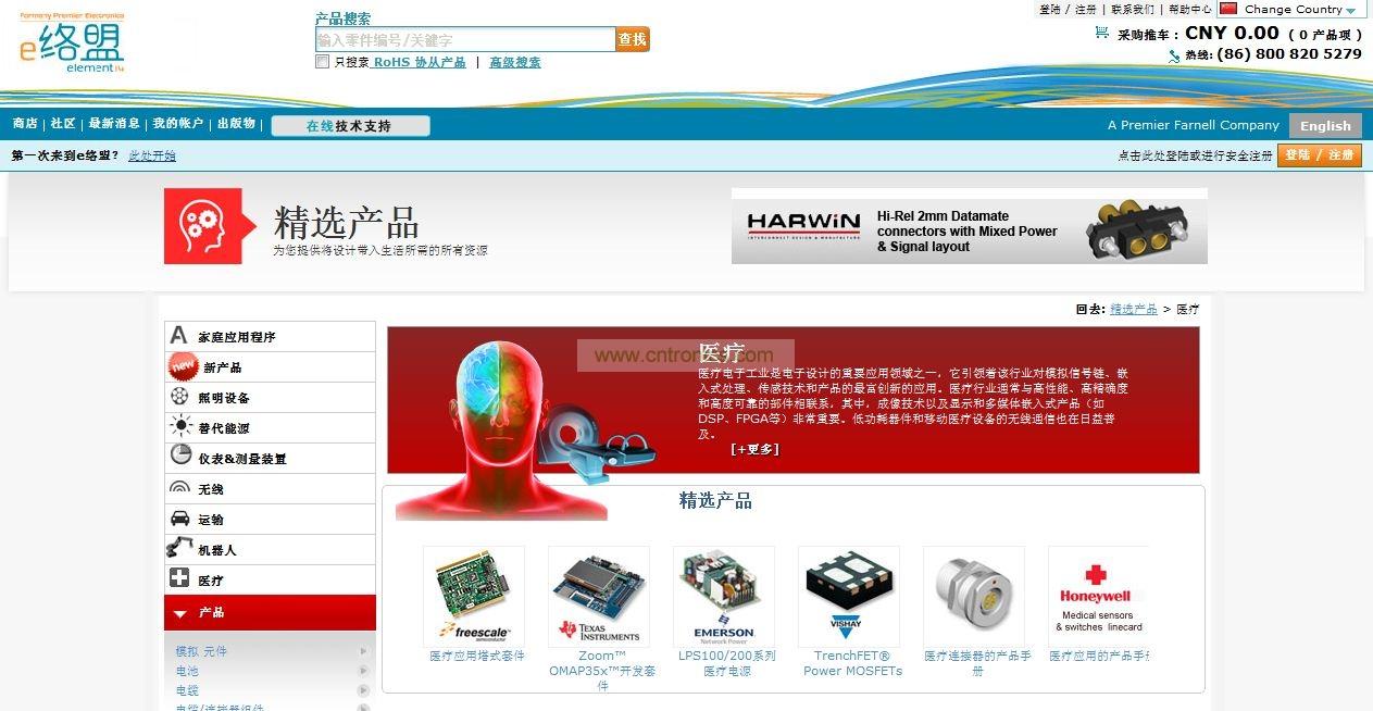 高性能、高精度和高可靠性部件對醫療行業至關重要。e絡盟的醫療子站率先采用創新模擬信號鏈、嵌入式處理和傳感技術以及世界領先供應商的產品,如Altera、Fischer、鬆下、德州儀器和XP電源。醫療成像在亞太區采用廣泛,尤其是顯示與嵌入式多媒體產品,如DSP和FPGA。低功耗設備和移動醫療設備的無線通信也日益普及。