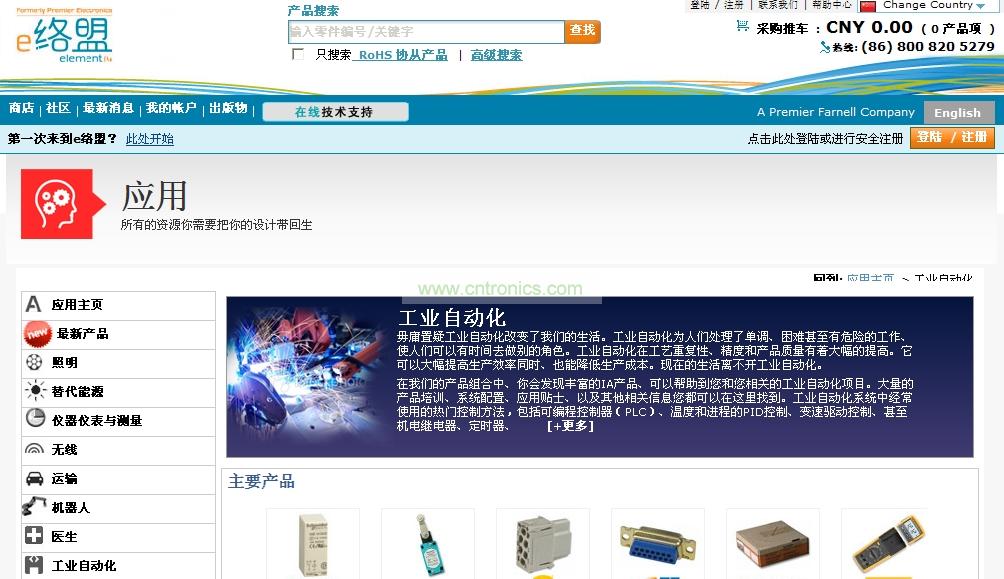 工業自動化可處理諸多生產中重複、人工難以完成、甚至是危險的工作,節省出的人員可承擔其它工作。製造廠家如浩亭(Harting)、霍尼韋爾,莫仕(Molex)、施耐德和TE Connectivity的控製解決方案在e絡盟子站中均可找到,包括可編程控製(PLC)、溫度和工藝PID控製,可變速驅動控製、甚至還包括機電繼電器、計時器和計數器控製。