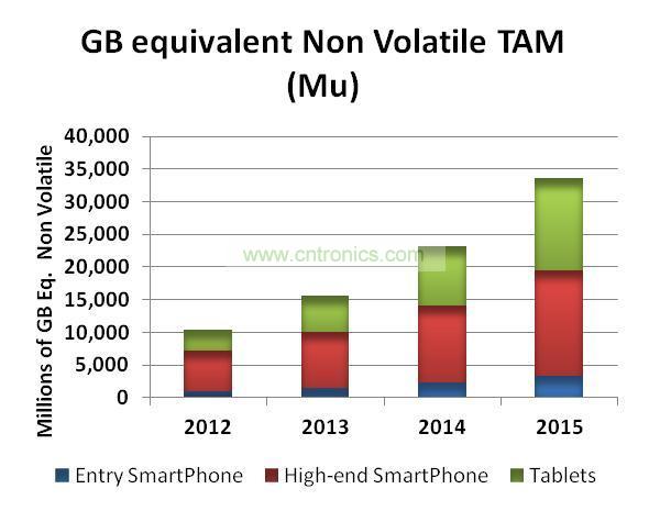 對於存儲器的市場需求,陶女士預測,2012年全球半導體市場將達到$313B,其中DRAM達到DRAM $32.1B,Flash 達到$32.4B,這兩塊加起來占到全球半導體市場的20%以上。非易失性的存儲器將從2012年到2015年一直以直線方式增長。對於Entry Smart,目前非常重要的趨勢是從NAND向e.MMC+LPDDR1/2方向發展。它的容量是4-8GB e.MMC 疊加 2-4Gb LPDRAM。針對高端智能機,由於它對EMC性能的要求更高,所以對於一些高性能的智能機,容量主要集中在由8/16GB,後續向64GB e.MMC發展,現在已經出現32GBe.MMC。在平板這一塊,由於它高容量的需求,目前基本上是從16GB一直到將來的256GB發展,從2012年趨勢來看,將達到128GB,到2015年,大部分需要達到256GB。