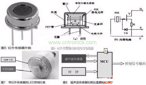 被動式紅外傳感器有三個關鍵性的元件:菲涅爾濾光透鏡,熱釋電紅外傳感器和匹配低噪放大器。菲涅爾透鏡有兩個作用:一是聚焦作用,即將熱釋紅外信號折射在PIR上:二是將探測區內分為若幹個明區和暗區,使進入探測區的移動物體/人能以溫度變化的形式在PIR上產生變化的熱釋紅外信號。一般還會匹配低噪放大器,當探測器上的環境溫度上升,尤其是接近人體正常體溫(37℃)時,傳感器的靈敏度下降,經由它對增益進行補償,增加其靈敏度。輸出信號可用來驅動電子開關,實現LED照明電路的開關控製。圖5是紅外傳感器外貌,圖6是紅外傳感器內部結構與內部電路圖。圖7是帶紅外傳感器的LED照明燈具,這是一款E27標準螺口燈頭的燈具,其電源適用範圍是AC180V-250V(50/60Hz),紅外傳感器檢測範圍大約在3m~15m,其標準產品IFS-Bulb3W燈具達80lm,5W燈具達140lm.在LED光源模塊的中央部分嵌入紅外線傳感器。一旦紅外傳感器檢測到人的體溫,LED電燈泡將會在50s內自動開啟與關閉。適用於任何一種室內應用,如走廊、儲藏室、樓梯和大廳入口處。