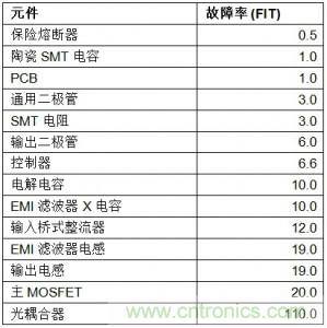 我們看一下各種LED驅動器的材料清單。例如,我們使用了帶有10W負載的小功率A19設計,並假設類似的元件適用於五種拓撲。表1列出每個元件和其相關的FIT數值,其中光耦合器的故障率最高。(注意:FIT數值不包含加速因素)。