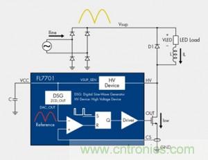 FL7701集成有功率因數校正(PFC)。可以從使用小型陶瓷維持電容的整流離線輸入來供電。這樣就可省去輸入端的電解電容,也不需要用於IC的自偏置電源軌。