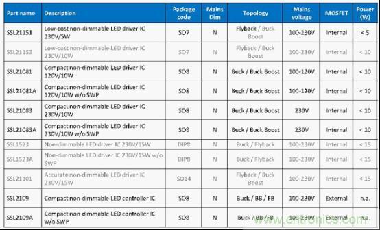 圖1 NXP中小功率市電供電非調光LED驅動IC選型表格
