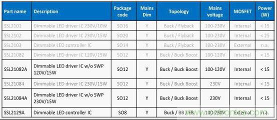 圖2 NXP中小功率市電供電可控矽調光LED驅動IC選型表格