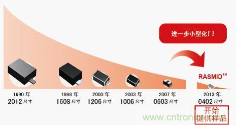 【導讀】ROHM采用全新工藝方法,開發出超越微細化界限的世界最小元器件“RASMID™係列”,有助於移動設備進一步小型化。本文從ROHM的RASMID™係列的特點、二極管的小型化曆史等方麵進行介紹。
