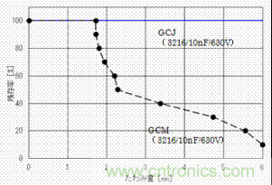 根據這個評價結果,於一般用2端子的MLCC(GCM係列)的殘存率的比較如圖7、圖8所示。GCJ、KCM/KC3係列,電路板的偏轉量在6mm的時候也看不見對陶瓷部分的破壞,於GCM係列相比耐電路板彎曲性有了飛速的改善。