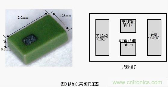 有了上述的構造,以天線的組抗整合的簡易化為目的試製高頻變壓器並評價。試製品的尺寸為2.0mm×1.25mm×0.6 mm的表麵貼裝元器件(SMD)(圖3)。在試作品的RF電路側連接50Ω係的測定器,天線連接側的阻抗和動畫如圖4所示。試製變壓器將low band(892MHz)轉換成12→50Ω,high band(1940MHz)裝換成了19→50Ω。