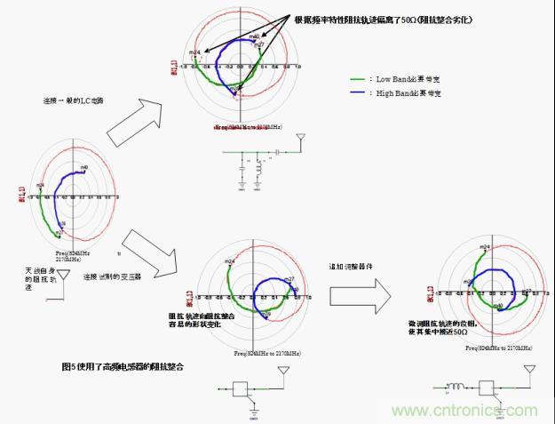 將普通的LC電路跟天線連接,根據頻率特性的不同在廣帶寬情況下阻抗整合會變得困難。針對該情況,將本次試製的高頻變壓器跟天線連接,low band和high band都dou轉zhuan換huan成cheng了le最zui合he適shi的de阻zu抗kang。也ye就jiu是shi說shuo,工gong匠jiang圖tu上shang的de阻zu抗kang軌gui跡ji有you可ke能neng變bian化hua成cheng阻zu抗kang整zheng合he容rong易yi的de形xing狀zhuang。之zhi後hou通tong過guo外wai部bu的de調tiao節jie元yuan件jian將jiang阻zu抗kang軌gui跡ji的de相xiang位wei進jin行xing微wei調tiao,有you可ke能neng非fei常chang容rong易yi的de就jiu集ji中zhong在zai50Ω附近了。(圖5)