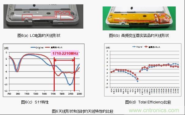 結果顯示,low band 情況下LC電路和高頻變壓器都不可能達到「S11<-6dB」(反射損耗1.2dB)。而high band情況下,達到「S11<-6dB」範圍的,如果使用LC電路的話是300MHz,而使用高頻變壓器的話則是500MHz,達到了66%的改善效果。(圖6(c)) 。此外,LC電路和高頻變壓器中天線的綜合特性顯示「Total Efficiency」,low band的高頻側也得到了0.6dB的改善效果。(圖6(d))。這種改善效果正是由於帶寬的廣帶寬化和I.L.得到了改善。