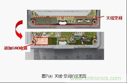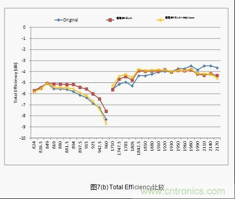 接下來將針對天線小型化的有效性進行檢測。一般來說天線具有改善接地距離的特性。但是,天線占據空間(排除了GND領域)很大的話天線以外的 元器件安裝空間就會受壓迫。天線小型化和縮小天線空間迫在眉睫。當天線空間的一部分被GND占據,對這時候的天線特性的變化進行評價。天線空間的寬度為52mm,其中13mm被GND占據,low band的特性劣化,變成了跟LC電路等同的Total Efficiency(圖7(b))。這就意味著實際上天線空間的麵積可減少25%。