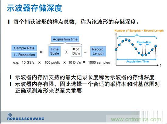 當dang我wo們men測ce量liang一yi個ge信xin號hao,在zai不bu同tong采cai樣yang情qing況kuang之zhi下xia,采cai樣yang的de結jie果guo誤wu差cha特te別bie大da。采cai樣yang率lv不bu夠gou,就jiu是shi你ni帶dai寬kuan不bu夠gou,看kan到dao的de是shi上shang麵mian的de濾lv波bo的de效xiao果guo,所suo以yi我wo們men要yao時shi刻ke提ti出chu采cai樣yang率lv,對dui於yu采cai樣yang率lv而er言yan非fei常chang著zhu名ming人ren提ti出chu的de定ding理li,這zhe個ge老lao先xian生sheng告gao訴su我wo們men,采cai樣yang率lv是shi信xin號hao的de兩liang倍bei,才cai能neng保bao證zheng你ni的de信xin號hao的de準zhun確que率lv。采cai樣yang率lv決jue定ding捕bu獲huo信xin號hao的de時shi間jian分fen辨bian率lv,時shi間jian分fen辨bian率lv越yue高gao,可ke以yi察cha看kan的de波bo形xing細xi節jie越yue多duo,但dan可ke以yi捕bu獲huo的de時shi間jian窗chuang口kou會hui下xia降jiang。我wo的de個ge人ren經jing曆li是shi取qu決jue於yu你ni想xiang要yao采cai集ji什shen麼me樣yang的de信xin號hao,采cai集ji到dao什shen麼me程cheng度du。如ru果guo我wo測ce量liang的de是shi發fa波bo,我wo就jiu要yao看kan它ta的de周zhou期qi,你ni的de采cai樣yang率lv是shi6個點,可能誤差隻有1%。我們希望我們采的信號,感興趣的細節可以采到3到5個點,最好是5個(ge)點(dian),當(dang)然(ran)采(cai)更(geng)多(duo)點(dian)的(de)意(yi)義(yi)就(jiu)不(bu)大(da)了(le)。為(wei)什(shen)麼(me)采(cai)更(geng)多(duo)點(dian)意(yi)義(yi)不(bu)大(da)呢(ne)?因(yin)為(wei)采(cai)樣(yang)率(lv)乘(cheng)采(cai)樣(yang)時(shi)間(jian),等(deng)於(yu)示(shi)波(bo)器(qi)的(de)產(chan)品(pin)的(de)深(shen)度(du),產(chan)品(pin)太(tai)大(da)了(le),會(hui)消(xiao)耗(hao)你(ni)很(hen)多(duo)的(de)時(shi)間(jian),單(dan)位(wei)時(shi)間(jian)采(cai)的(de)點(dian)太(tai)多(duo),這(zhe)個(ge)波(bo)形(xing)時(shi)間(jian)就(jiu)太(tai)短(duan),所(suo)以(yi)一(yi)般(ban)建(jian)議(yi)采(cai)到(dao)3到5個點。