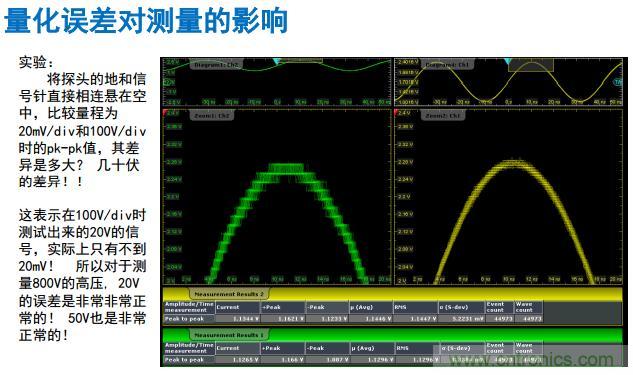 很多人覺得不可思議,為什麼零伏的測試信號是30伏呢?就是這個原因。因為半導體的製作工藝的原因就是這裏。當100伏/格的時候,正常測量的範圍是800伏除以256,最終結果差不多是30。這個是高壓測量的例子。所以平時用示波器測量電源的文波的時候,我們應該怎麼做?如果是測量3.3伏的電流波,永遠要把探頭在地上的帽子拔掉,這個用短的地環。如果測1.8伏以下的電流波,紋波隻有3豪伏以下的時候怎麼做?勇敢要把探頭拔掉。為什麼?因為很多探頭插上去之後,最小是1毫伏/格,直接就變成了10毫伏/格,你的示波器的量化、噪聲,加上隨機噪聲,遠遠的大於你的被測信號的噪聲,測量的結果就失去意義了。所以我們講的第一個原則就是量化最小測量誤差。