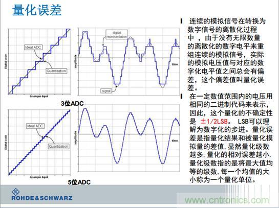 我們複習一下示波器的基本原理,把模擬信號變成影響點的各個。在數字空間裏,永遠都有0和1,每一個0和1代表的電壓的大小是多少呢?通常是8位的0和1組成一個電壓。電阻裏的電源的電壓是400伏,還是低壓5毫伏,都可以進行量化。每一個0和1代表的電壓是多少呢?這個是最小有利的比特位。特殊講,就是示波器的每一個路徑,示波器乘1111111,變成了11111110,最後一位從1變成0的跳變,代表了電壓的大小是多少呢?是取決於平時用示波級的量程。如果示波器1伏每格的時候,你0和1的跳變大約是30毫伏的變化。這個是示波器外邊的電壓的變化,30毫伏的電壓對示波器是沒有影響的,示波器感覺不到。這個就像平時用1厘米的刻度尺來測量頭發的時候發現無法測量,這個是基本的道理。