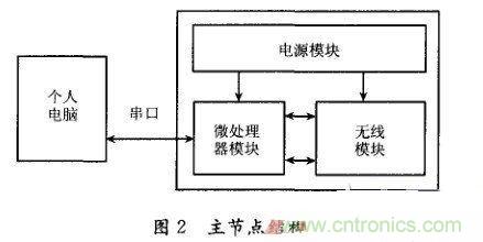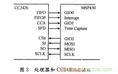 主 控節點結構如圖2所示。它通過串口與PC主機交互數據,通過無線模塊與艙內子節點通信,同時管理和協調艙內各節點的工作時序和同步。其中,微處理器用TI 公司超低功耗的MSP430F149,無線通信模塊選用Chipcon公司的2.4GHz頻段射頻低功耗接口芯片CC2420,電源模塊采用DC/DC電 源變換模式。MSP430微控製器在16bitRISC核的基礎上集成了RAM和閃存,同時集成了8路A/D轉換模塊、傳輸速度可編程的串口模塊和一個靈 活的時鍾子係統,支持多種低功耗操作模式。CC2420芯片與IEEE802.15.4協議兼容,最大數據數率250Kbit/s,可編程控製輸出功率, 並支持錯誤校正和加密。MSP430可通過SPI接口和中斷數字I/O線對CC2420進行控製,如圖3所示。