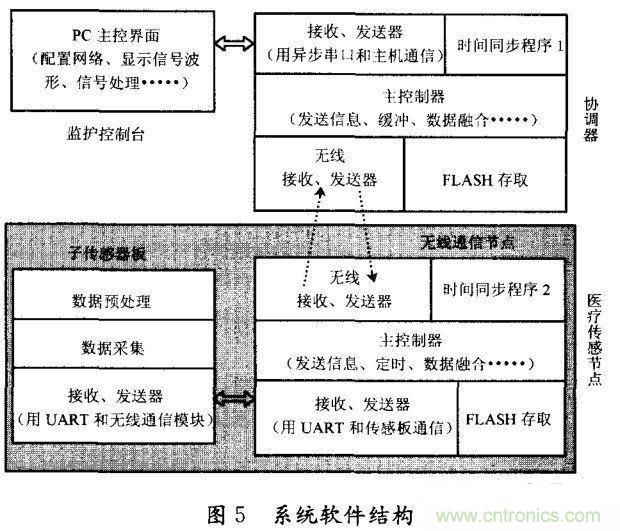 基於Zigbee星型網絡無線通信協議IEEE802.15.4,可穿戴式醫療監護設備的軟件係統主要具備控製程序、通信軟件和用戶界麵等三大功能,具體分布在PC控製主機程序、網絡協調器軟件和傳感子節點軟件中,如圖5所示。