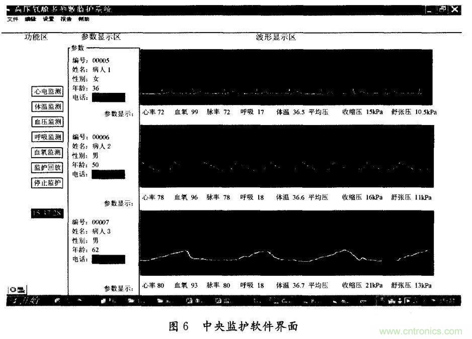 隨著無線通信網絡和傳感器等技術發展,醫療監護技術和方式將發生根本變化。高壓氧艙已廣 fanyingyongyulinchuangjibingjiuzhi,cangneishenglijianhuxitongshigaoyayangzhiliaoguochengzhongduiweizhongbingyuanjinxingshenglizhibiaojianhudezhongyaoshebei。youyugaoyayangcangneideteshuhuanjing,xianyoujianhushebeiduicangneibingrende 心電、血壓、呼吸、脈搏及血氧飽和度等參數的監護存在局限性,主要表現在:①多個傳感器通過有線的方式和處理器相連接;②獨立的傳感器間缺乏係統整合;③ 不支持信號的持續采集和數據的實時處理;④分別的監護設備間無法共享無線通信資源。研製一種基於無線傳感技術的可穿戴式多參數監護設備,可更好地適應高壓 氧艙特殊環境和臨床救治的需要。該監護儀要求心電、血壓、血氧飽和度、脈搏、呼吸、體溫檢測等電路模塊采用超低功耗器件,並結合硬、軟件省電設計,使氧艙 內監護終端可采用電池供電;信號采集轉換後,一方麵在艙內監護終端(子機)上顯示,並通過Zigbee等無線傳輸技術將采集信號送入艙外中央監護PC終端 (主機)上,實現艙內外同步監測。