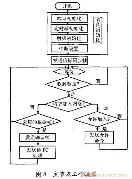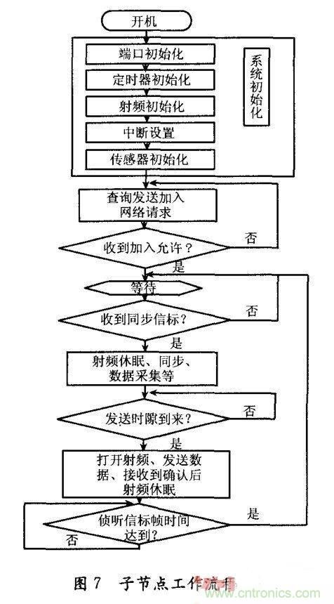 傳 感節點軟件和傳感器協調器軟件的程序流程分別如圖7和圖8所示。本流程在IEEE802.15.4協議基礎上,結合TDMA技術和無線傳感器網絡S- MAC協議思想而設計。從圖7可以看出,為了節省傳感節點的能耗,除加人網絡請求、發送數據和偵聽同步信標幀時段外,傳感節點均處於休眠狀態。